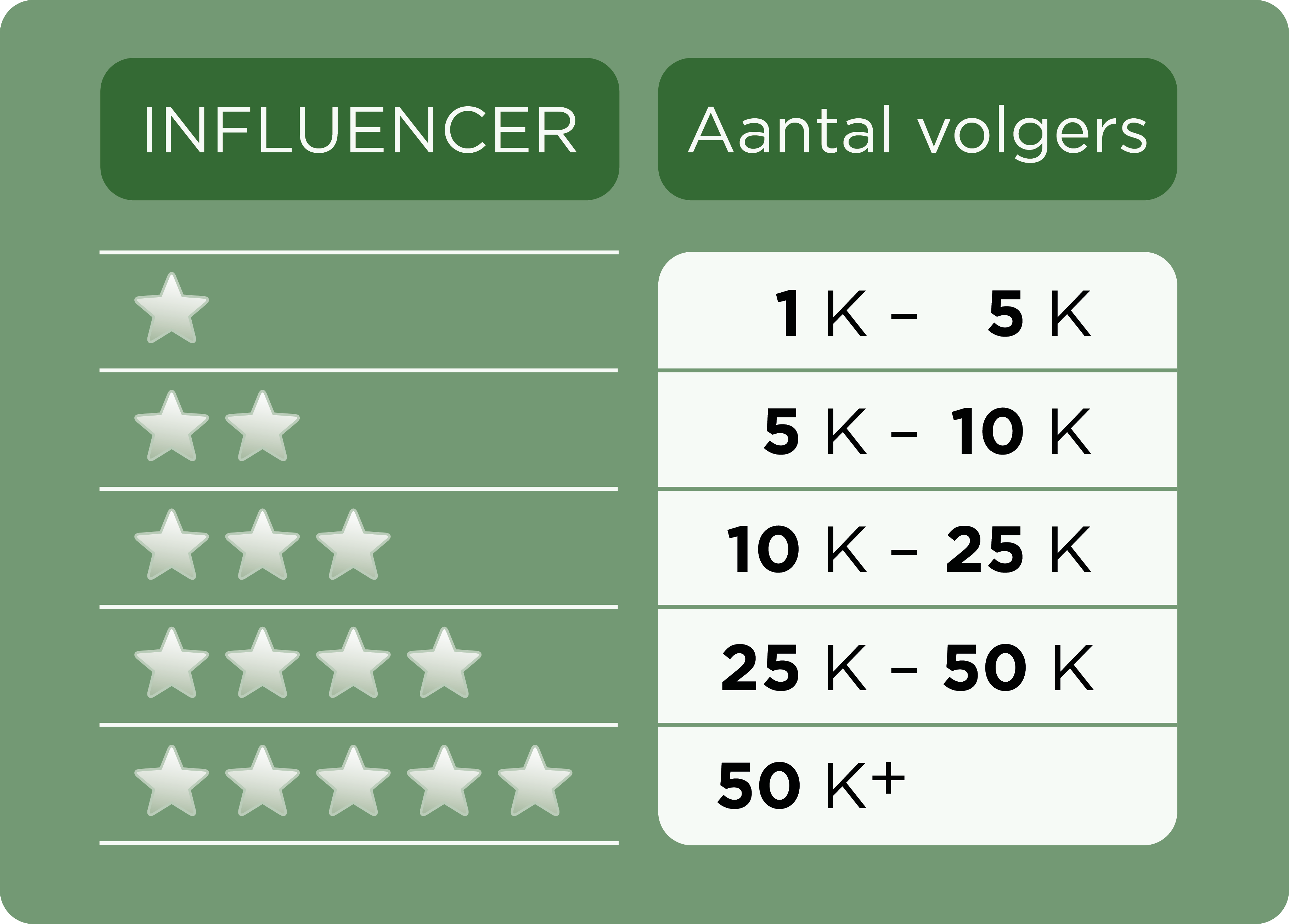 Als bedrijf kun je per deal bepalen wat je weggeeft, maar ook wat voor bereik je hiervoor terug wilt zien. Wij hebben onze influencers gecategoriseerd in sterren en elke ster staat voor het aantal volgers van de influencer op Instagram of Tik-Tok. Bekijk de influencer sterren